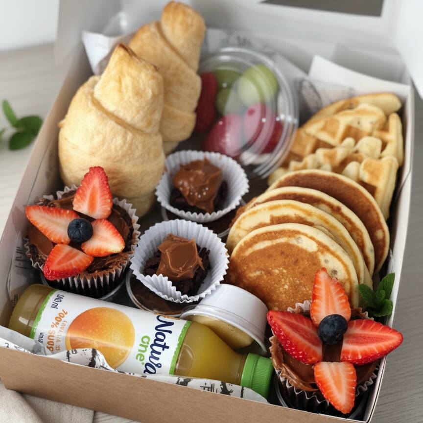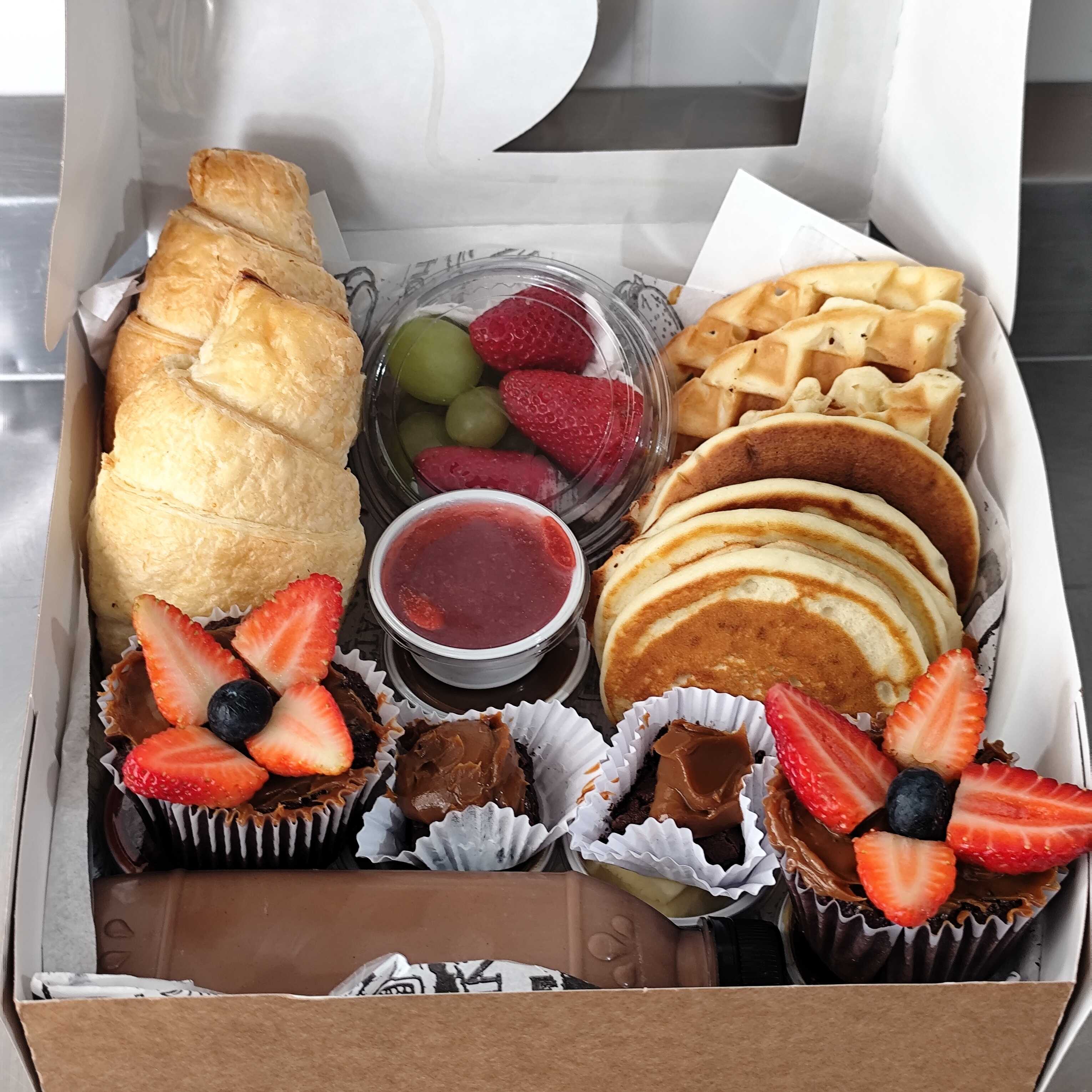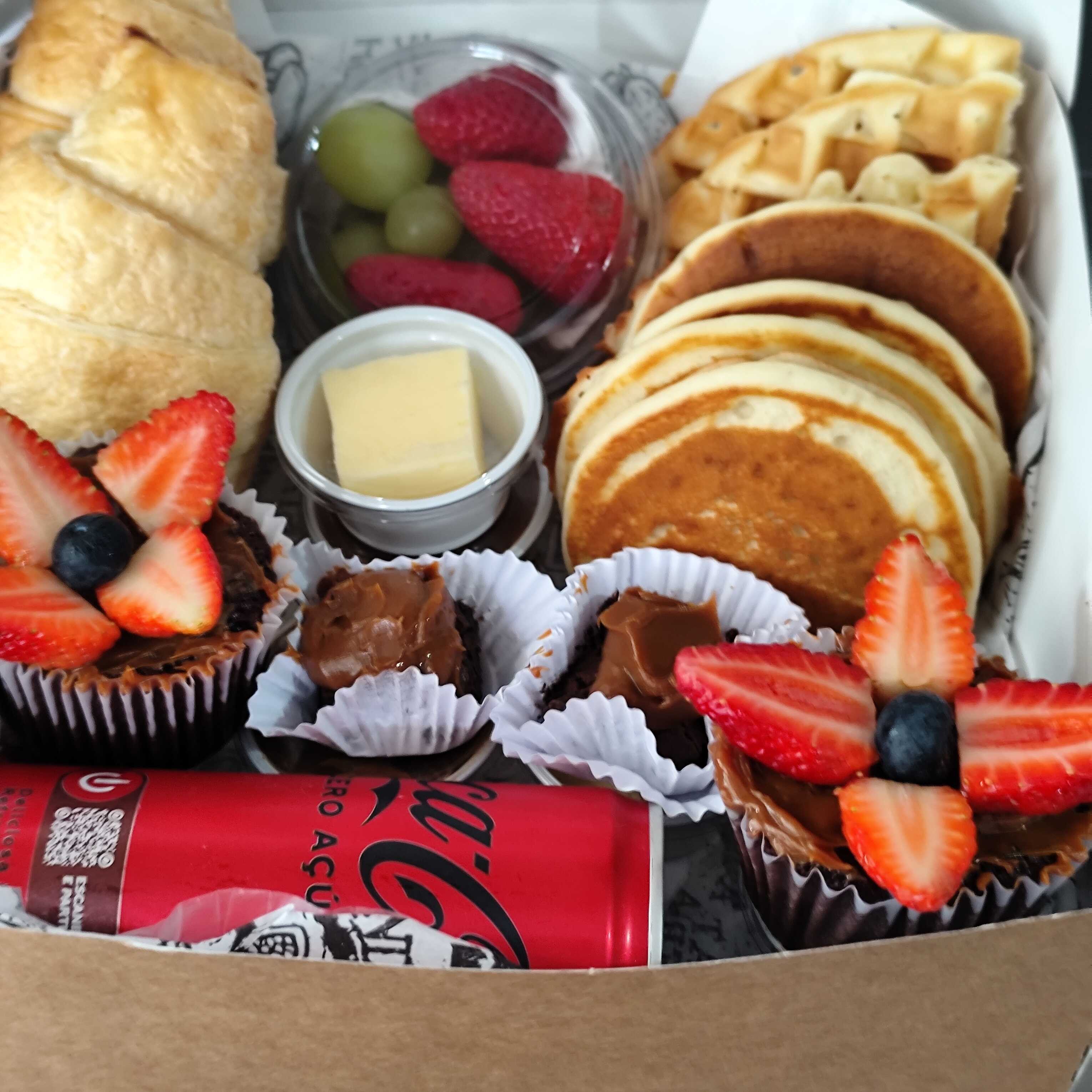 Na caixa de presente : 4 mini panquecas americanas 4 mini waffle 2 Croissant 2 cupcakes 2 mini Brownie 1 pote de frutas 1 mateiga 1 doce de leite 1 cream cheese 1 mel 1 geleia 1 coca cola 310ml presente, mimo, cesta de café da manhã. Presente aniversário, casamento, noivado. Cesta café da manhã Presente aniversário namoro noivado casamento empresa