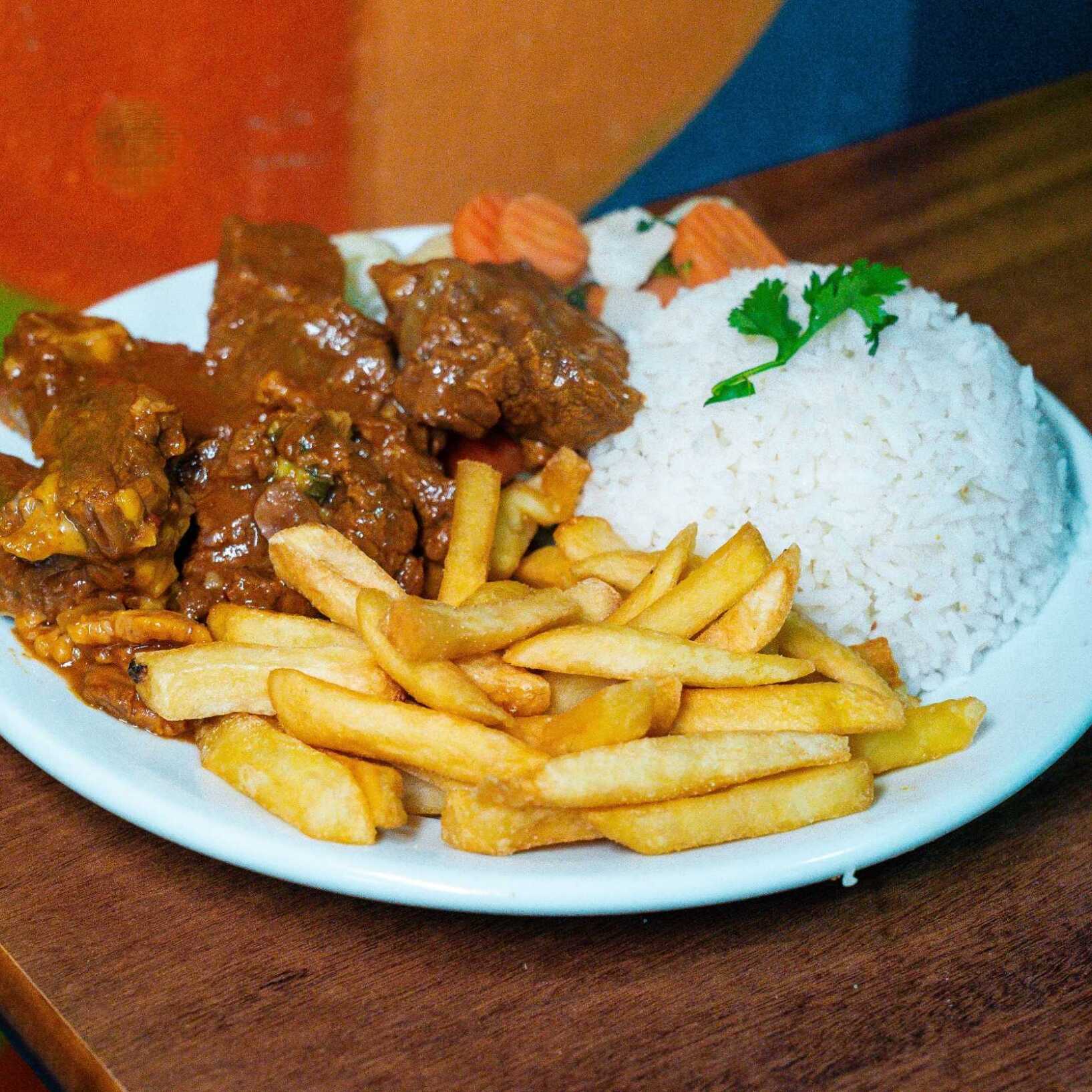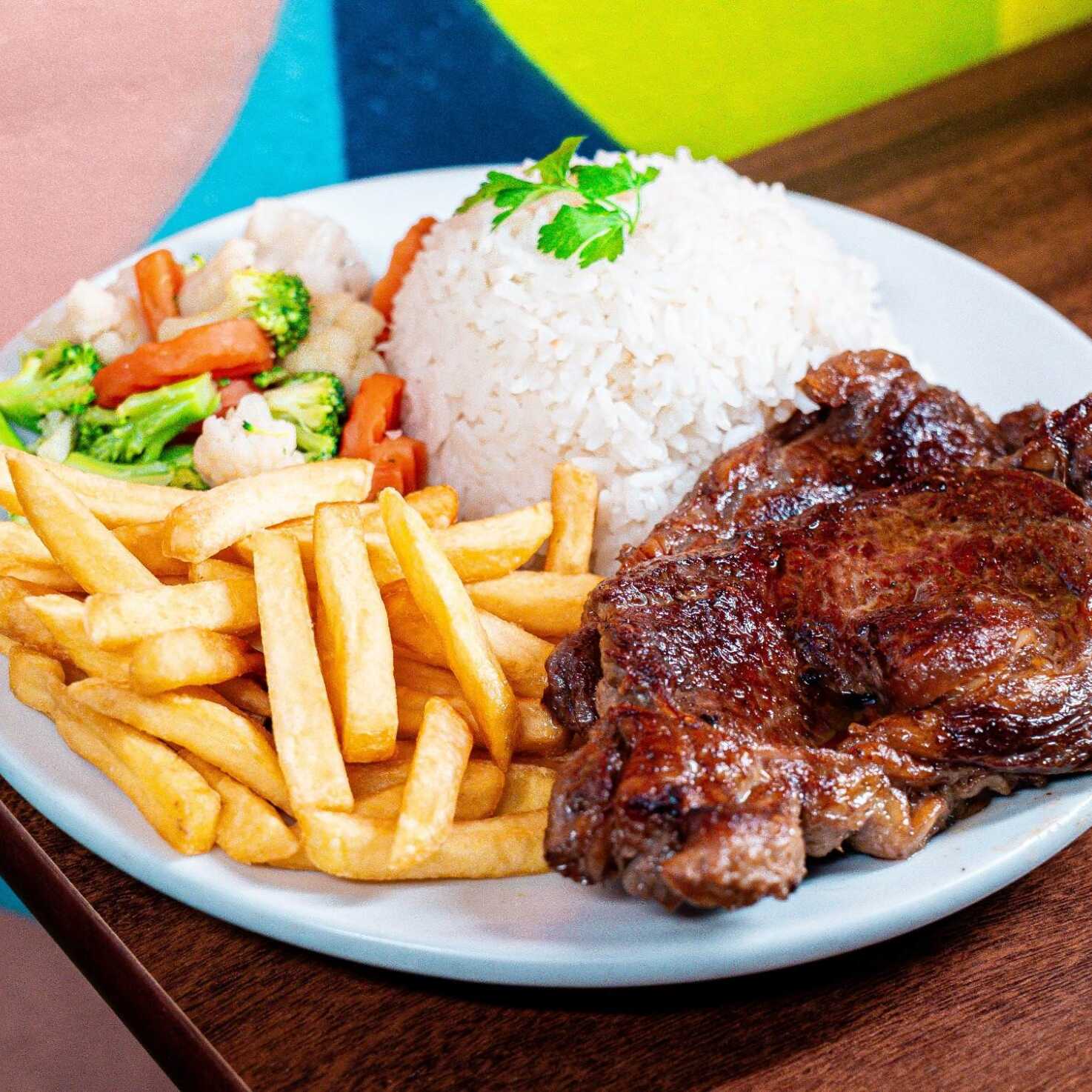 Acompanha contra filé, batata frita, couve, vinagrete de repolho e queijo coalho. A opção de baião é enviada somente na marmitex executiva (itens separados)