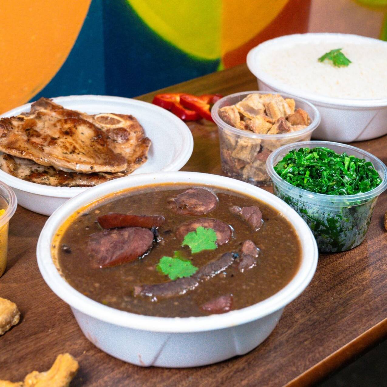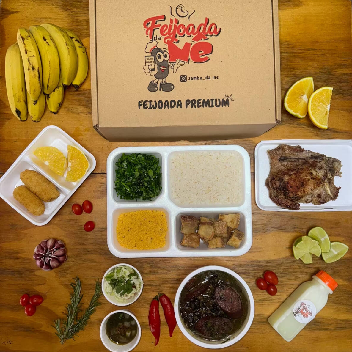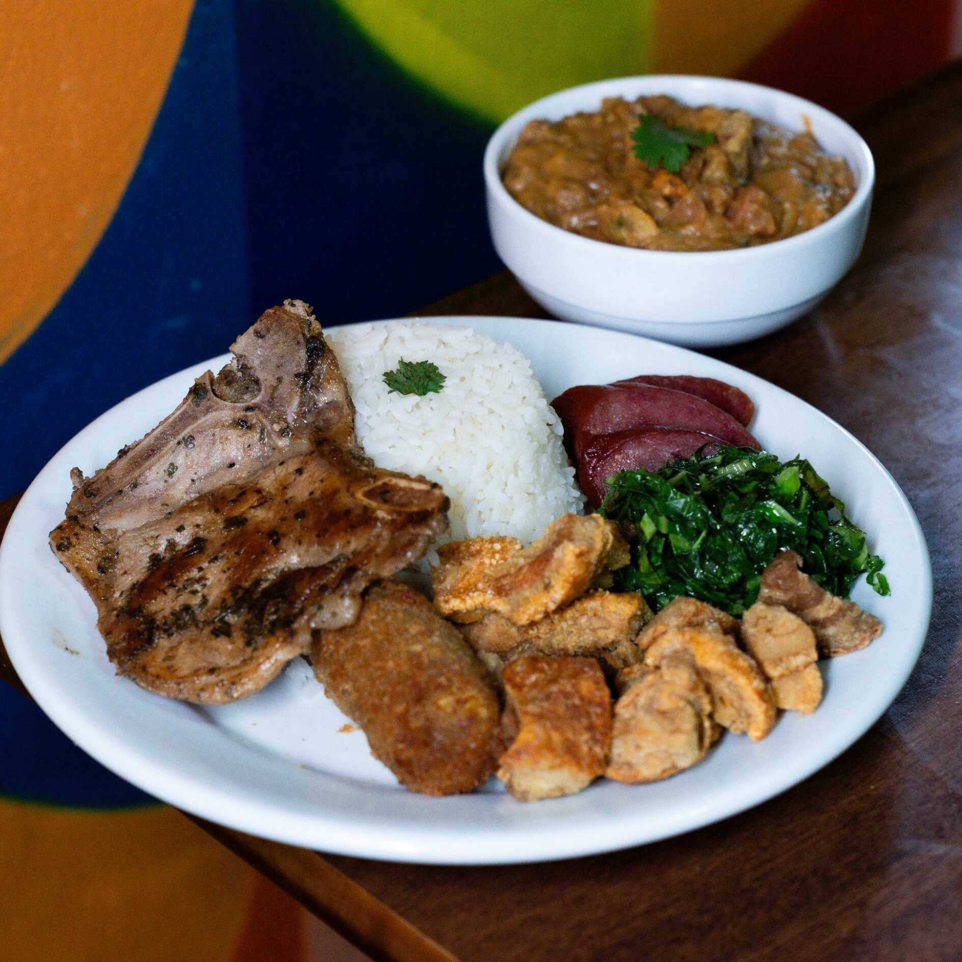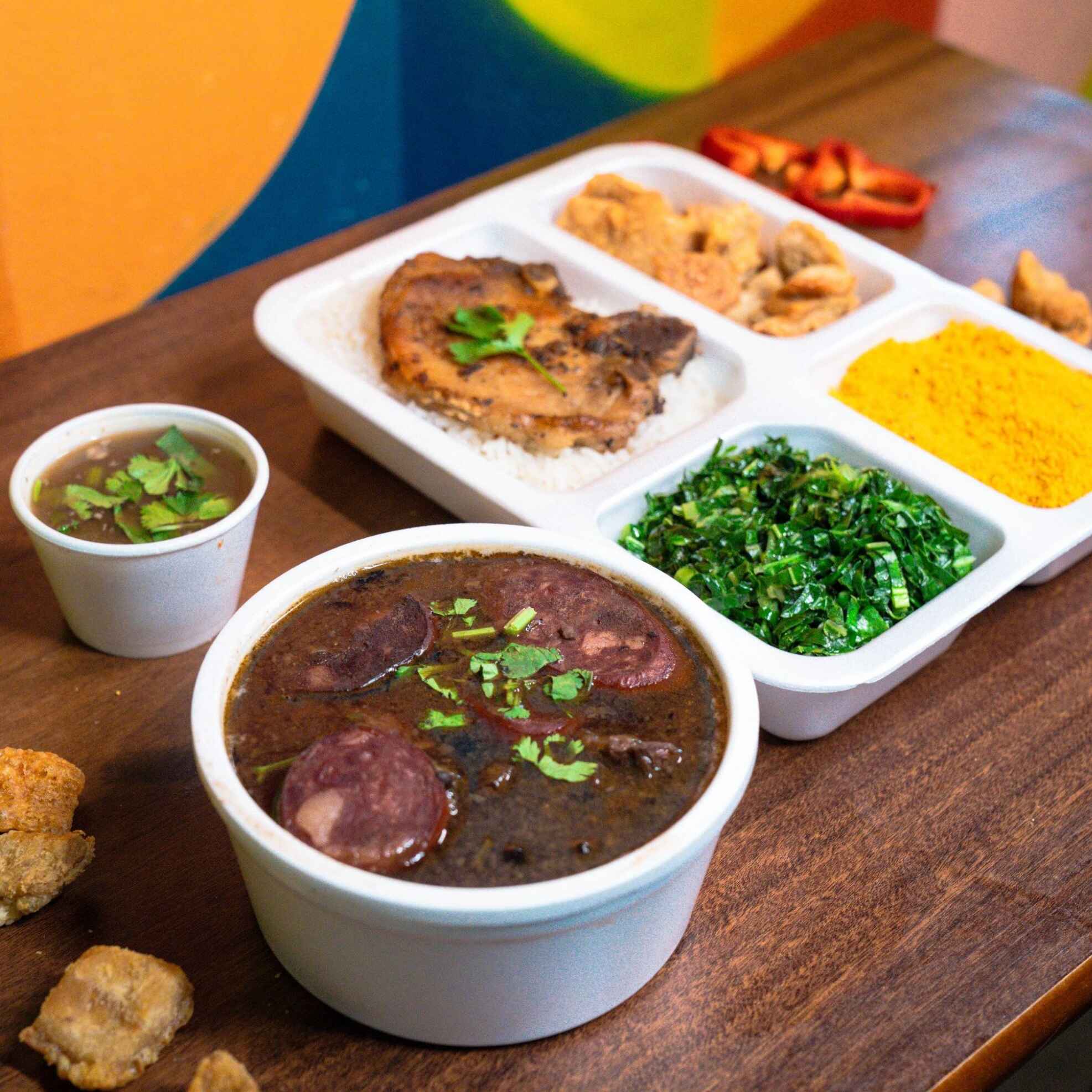 - Acompanha 1 bisteca, arroz, feijoada light (linguiça, paio, carne seca e lombo), farofa, couve, torresmo e molho de pimenta. - Nossa feijoada é preparada com bastante coentro e tempero baiano, se você possui o paladar sensível a esses ingredientes recomendamos escolher outro prato. Itens enviados separadamente.
