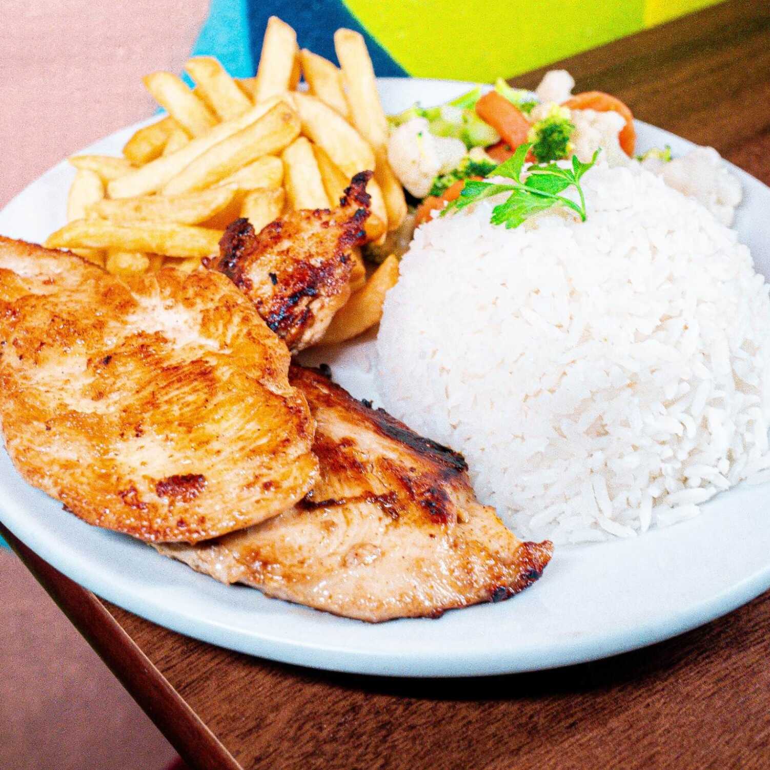 Comercial de filé de frango. Escolha seus acompanhamentos no próximo menu. Todos os itens são enviados separadamente em porções. Acompanha arroz e feijão.