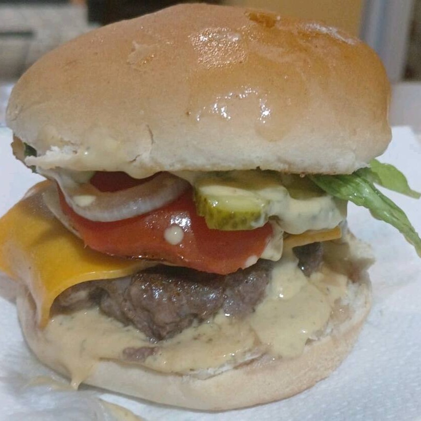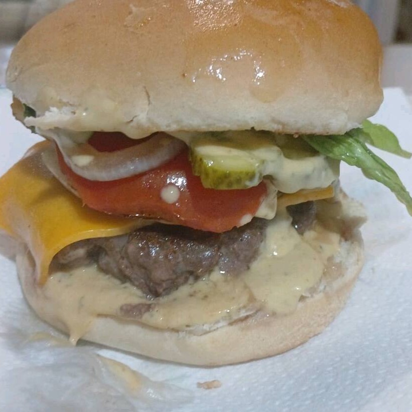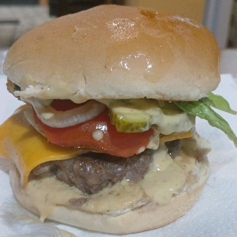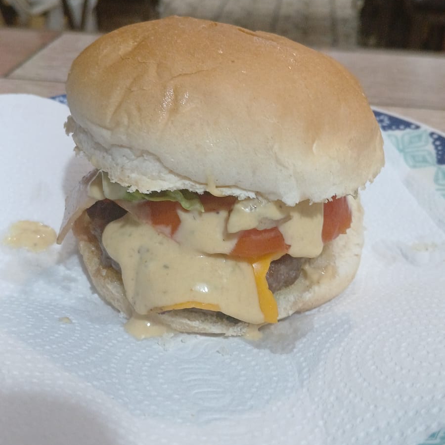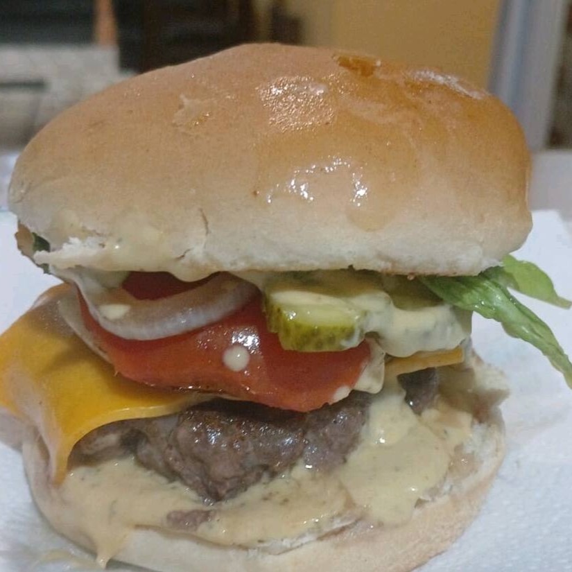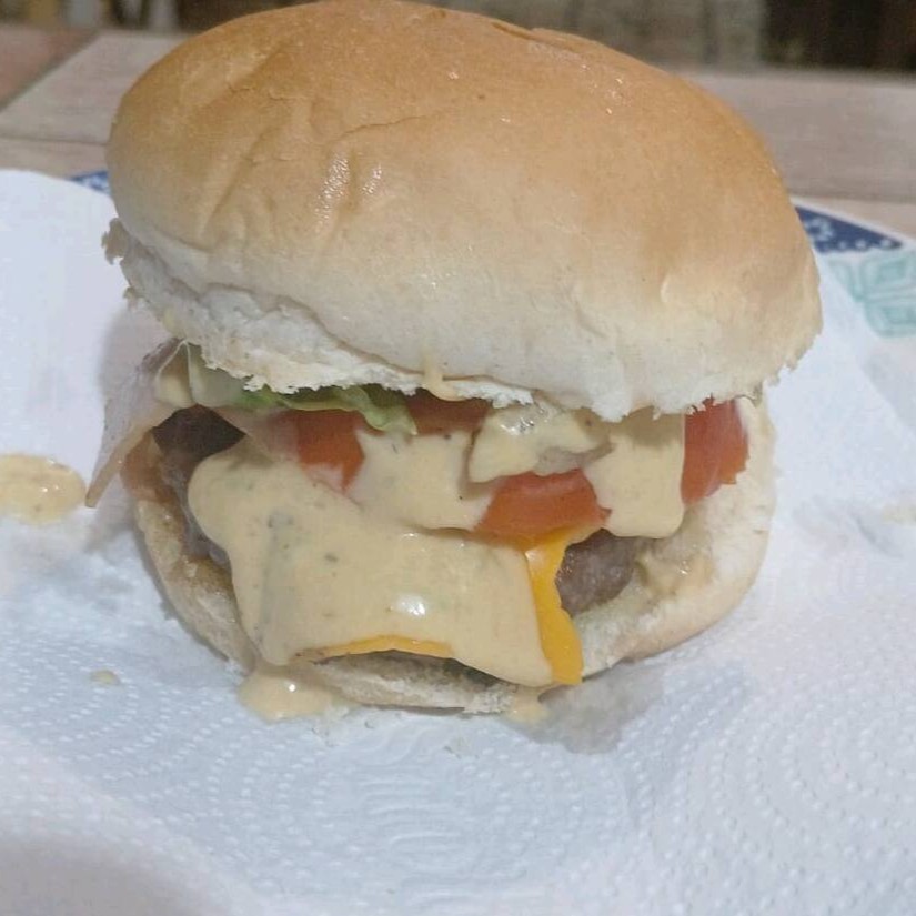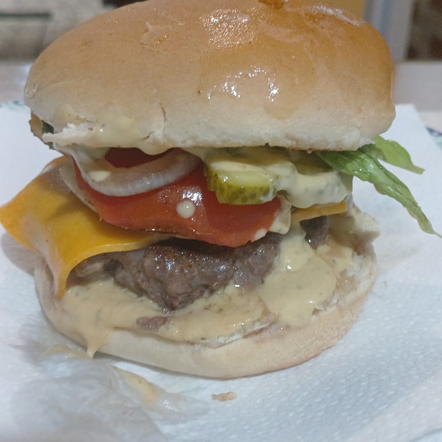 1 Hambúrguer artesanal 100 gramas 1 fatia cheddar alface tomate molho da casa catchup e maionese mostarda