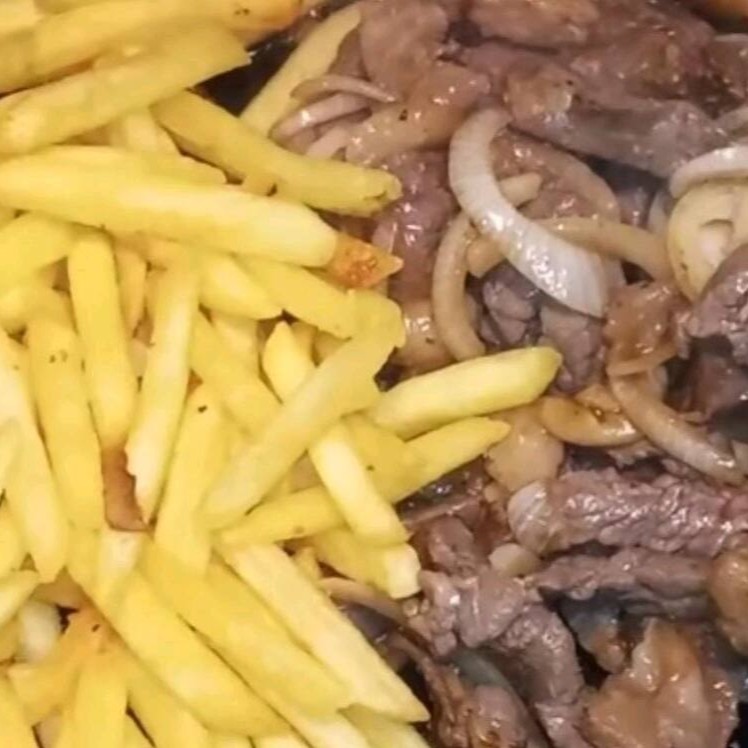 Contra filé na chapa em tiras podendo ser com ou sem cebola e batata fritas