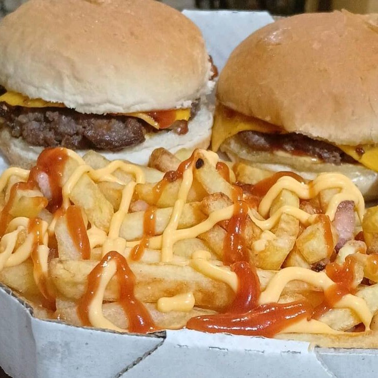 2 Hambúrguer artesanal 100 gr cada 2 fatia cheddar alface tomate picles fatias de bacon molho da casa catchup maionese mostarda a parte