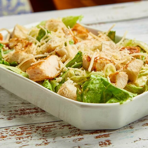 Alface Americana, Filé de Frango, Crountons e Molho Caesar.