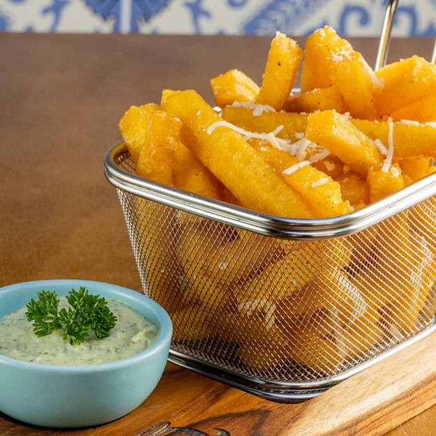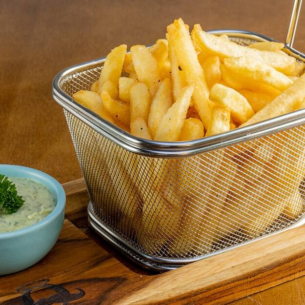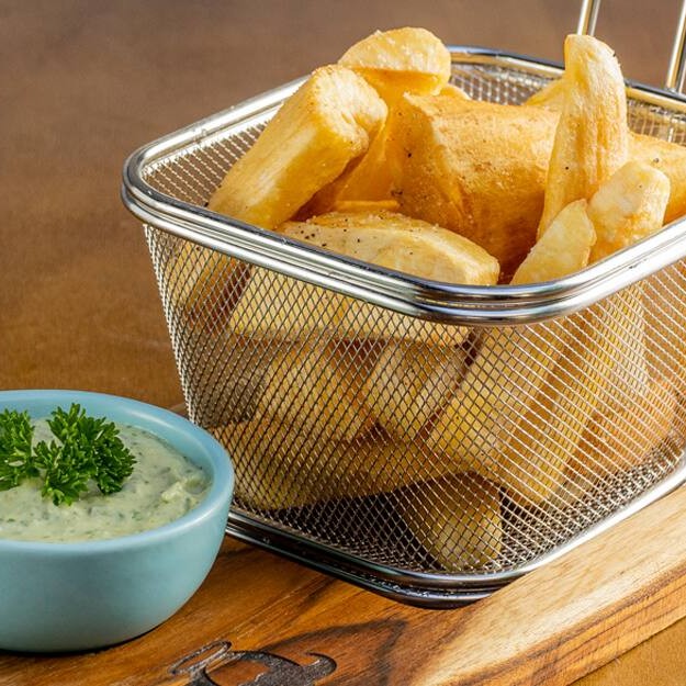 Tirinhas de peixe empanadas e fritas até ficarem douradas e crocantes, com interior macio e úmido. Acompanha molho tártaro cremoso, com toque cítrico que realça o sabor do mar. Petisco leve, fresco e perfeito pra dividir.
