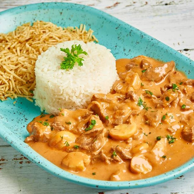 O clássico strogonoff de carne com cogumelos, arroz branco e batata palha crocante. Um prato que abraça o paladar com cremosidade e sabor marcante. Vem matar a fome com o toque do Santo Portuga!