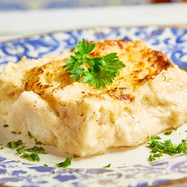 Postas de Bacalhau Gadus Morhua, Batata Soute, Cebola, Creme de Leite e Catupiry Gratinado no Forno com Parmesão.