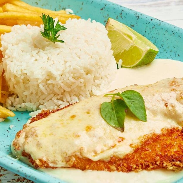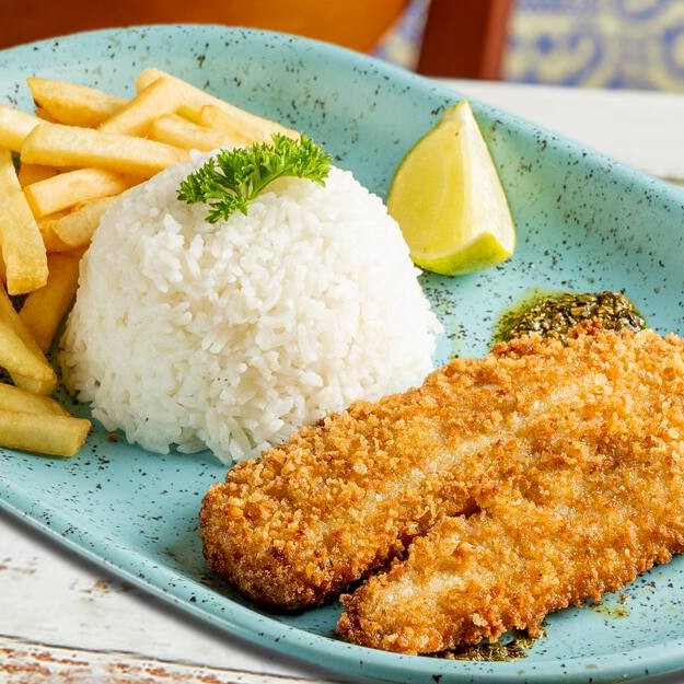 Tilápia empanada com molho branco cremoso, arroz soltinho, batata frita e uma fatia de limão pra dar aquele toque. Um prato leve, saboroso e com o jeitinho especial do Santo Portuga!