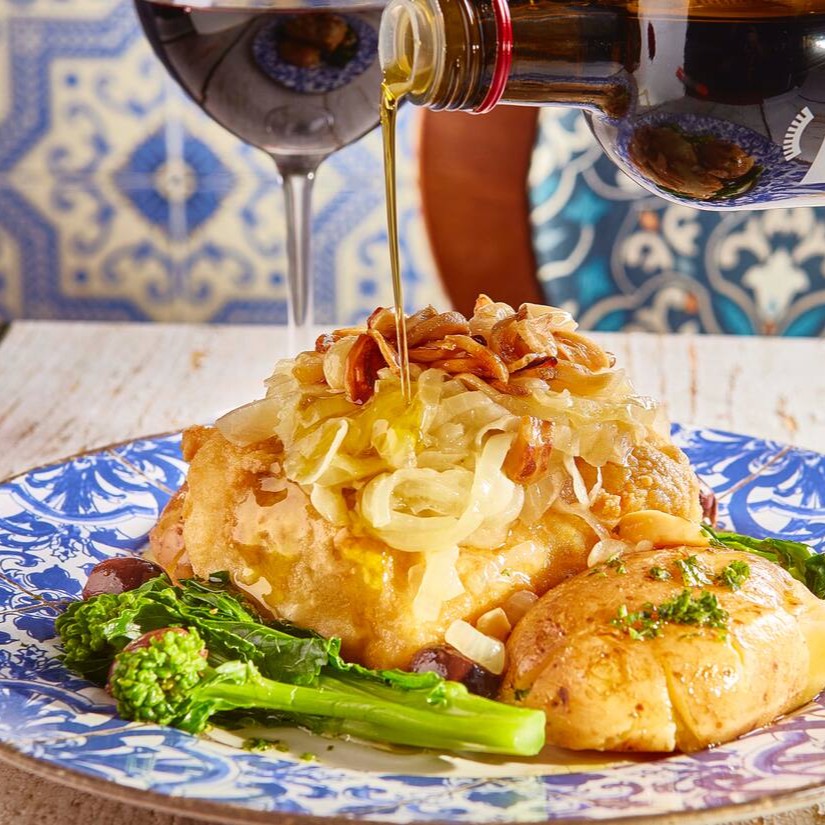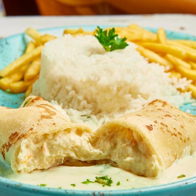 A Panqueca de Bacalhau do Santo Portuga é recheada com creme suave, coberta com molho branco e servida com arroz e fritas. Uma releitura deliciosa da nossa tradição portuguesa.