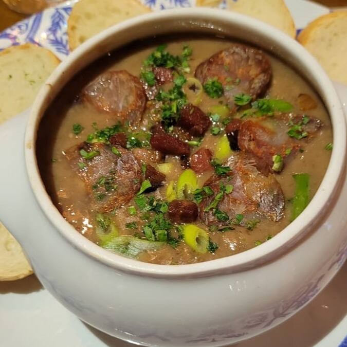 No Santo Portuga, o caldo de feijão ganha reforço de bacon e linguiça portuguesa, servido quentinho e cheio de sabor. Acompanha fatias de pão italiano pra completar a experiência. Rústico, encorpado e feito pra matar a fome com gosto!