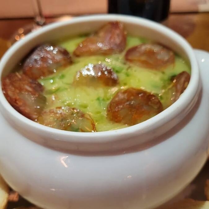 O tradicional Caldo Verde do Santo Portuga vem fumegante, com couve fresquinha, batata cremosa e lascas de linguiça portuguesa. Acompanha fatias de pão italiano pra mergulhar e se deliciar. Sabor que aquece a alma e faz lembrar casa de vó.