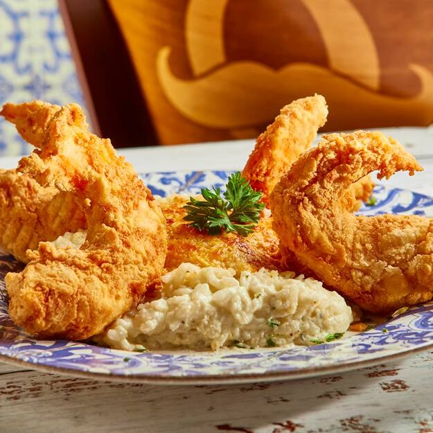 Camarão Grande Recheado com Catupiry, Empanado e Frito, com Arroz a Base de Gorgonzola gratinado ao Forno com Parmesão.