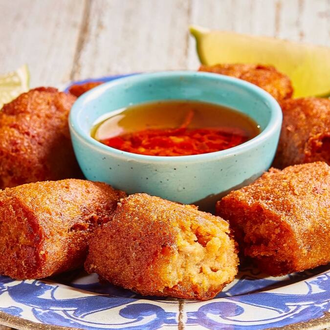 Bacalhau desfiado na medida certa, moldado à mão e frito até dourar. Por fora, casquinha crocante; por dentro, maciez que derrete. Um clássico português para abrir o apetite com elegância e sabor.