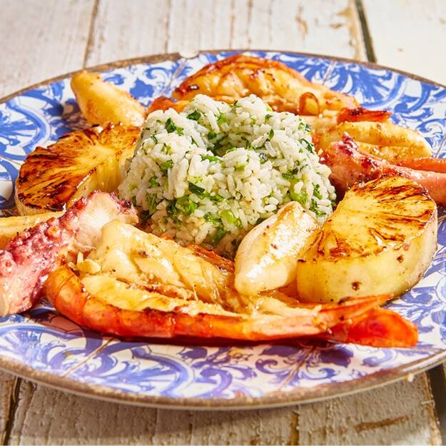 Lula, Polvo, Camarão Grande com Casca Aberto, Abacaxi, tudo puxado no azeite e ervas com Arroz de Brócolis.