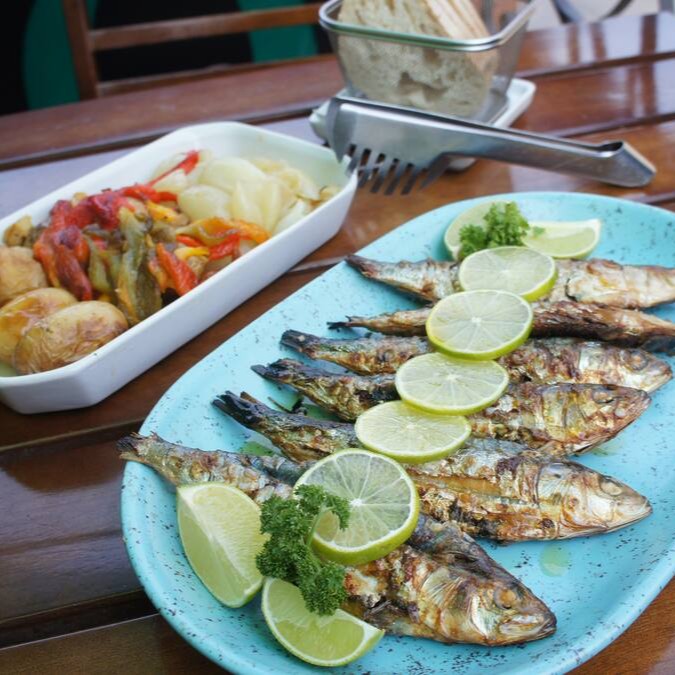 Sardinha Importada Grelhada na Brasa, com Salada de Pimentões coloridos, cebolinha cozida, Batatas Bolinha cozidas, tudo regado no azeite, acompanha cesto de pão italiano.
