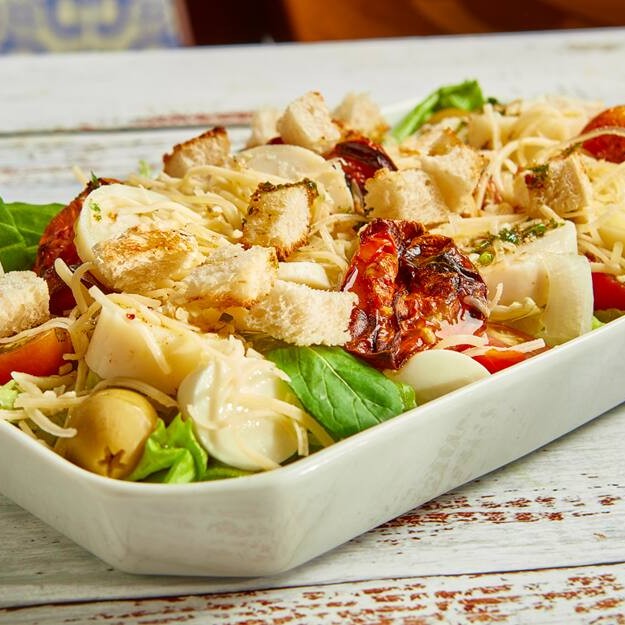 Palmito, Tomate Seco, Rúcula, Alface, Muçarela de Búfala, Azeitona, Crountons e Parmesão com Molho de Chimichurri.