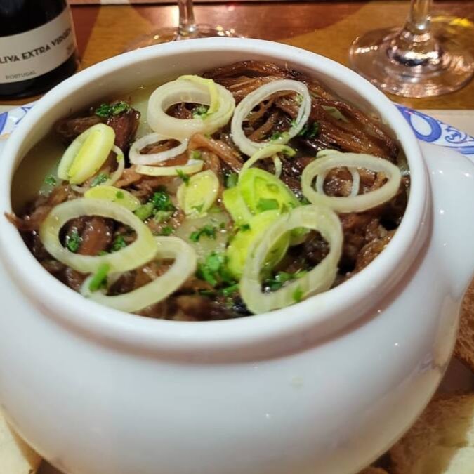 No Santo Portuga, o caldo de mandioca é cremoso e ganha reforço de costela de boi desfiada e alho-poró refogado no capricho. Acompanha fatias de pão italiano pra mergulhar e se apaixonar. É sabor de aconchego da primeira à última colherada!