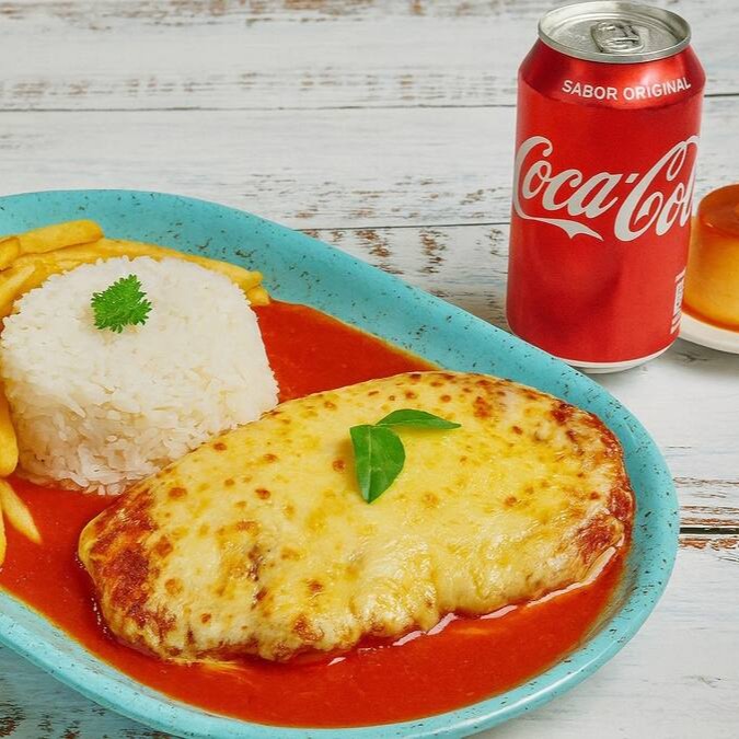 Filé de frango empanado crocante, coberto com molho de tomate caseiro e queijo gratinado borbulhante. Servido com arroz branco soltinho e batata frita dourada, acompanha uma Coca-Cola geladinha e de sobremesa especial um Pudim Executivo delicioso! Garanta logo o seu.