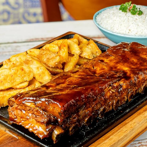 A Costelinha Barbecue do Santo Portuga é daquelas que grudam na memória (e no garfo)! Macia, suculenta e com aquele molho que faz a boca cantar. Vem com arroz e salada pra completar o banquete. Difícil é não lamber os dedos!