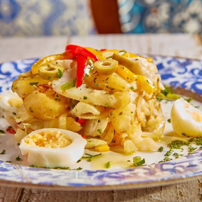 Lascas de Bacalhau Gadus Morhua, Cebola, Pimentões coloridos em tiras, Batata Soute, Azeitona e Ovo Cozido, tudo puxado no azeite.