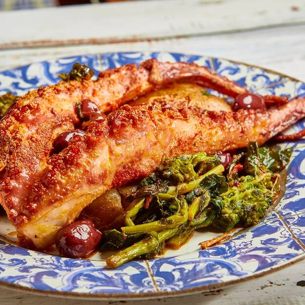 Tentáculos de Polvo importado, Batatas ao Murro, Azeitonas Preta, Brócolis puxado no alho e azeite, Coentro e Alho.