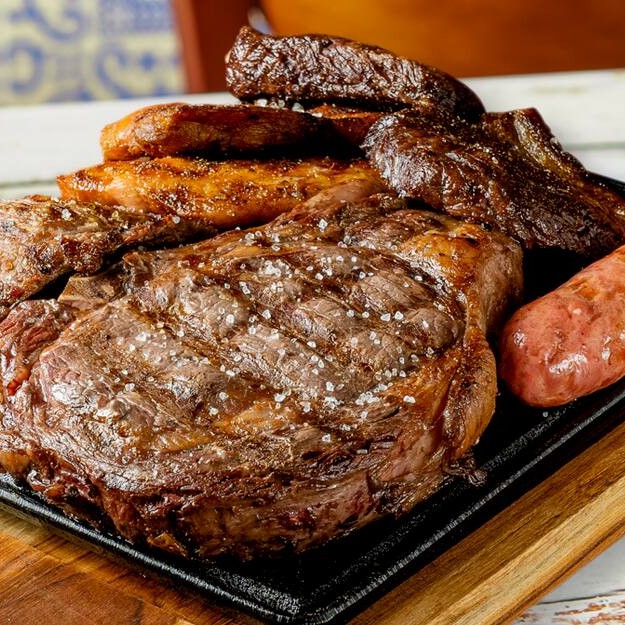 Essa tábua é pra quem leva churrasco a sério! São 1kg de carnes nobres in natura direto pra grelha: filé mignon, alcatra, chorizo, filé de frango e linguiça toscana — tudo acompanhado de arroz soltinho, batatas fritas, salada vinagrete e um molho à gaúcha que fecha com chave de ouro. Ideal pra dividir... Ou não!