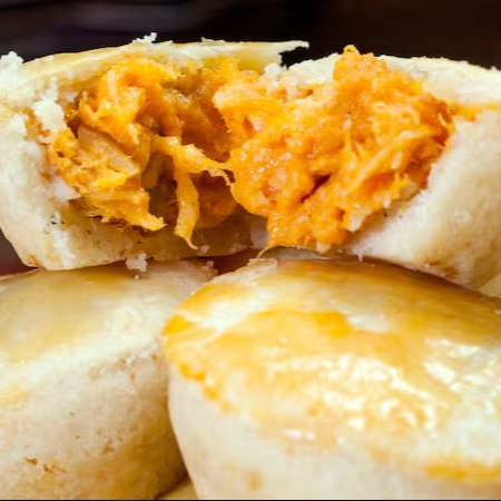Delicioso pão de batata recheado com calabresa e Catupiry Original, ótimo para lanches práticos e rápido, produto pronto e congelado, basta aquecer rapidamente no forno ou air frier.