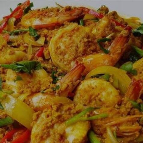 Camarão salteado com molho de ostra, ovo, pasta de pimenta, curry em pó, sal, açúcar, cebola, pimenta, aipo, cebolinha, não picante, adequado sem arroz.