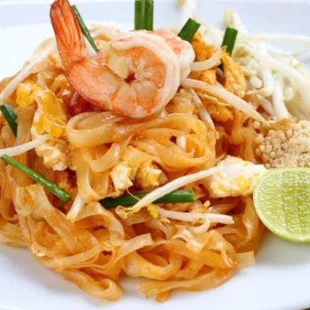 Pad thai Camarão Pad Thai com camarão Um dos pratos tailandeses mais famosos! Macarrão de arroz salteado com molho especial tailandês, camarões frescos, ovo, broto de feijão, cebolinha e amendoim triturado. Sabor agridoce, aromático e muito delicioso!