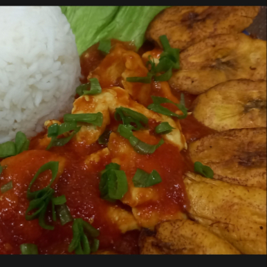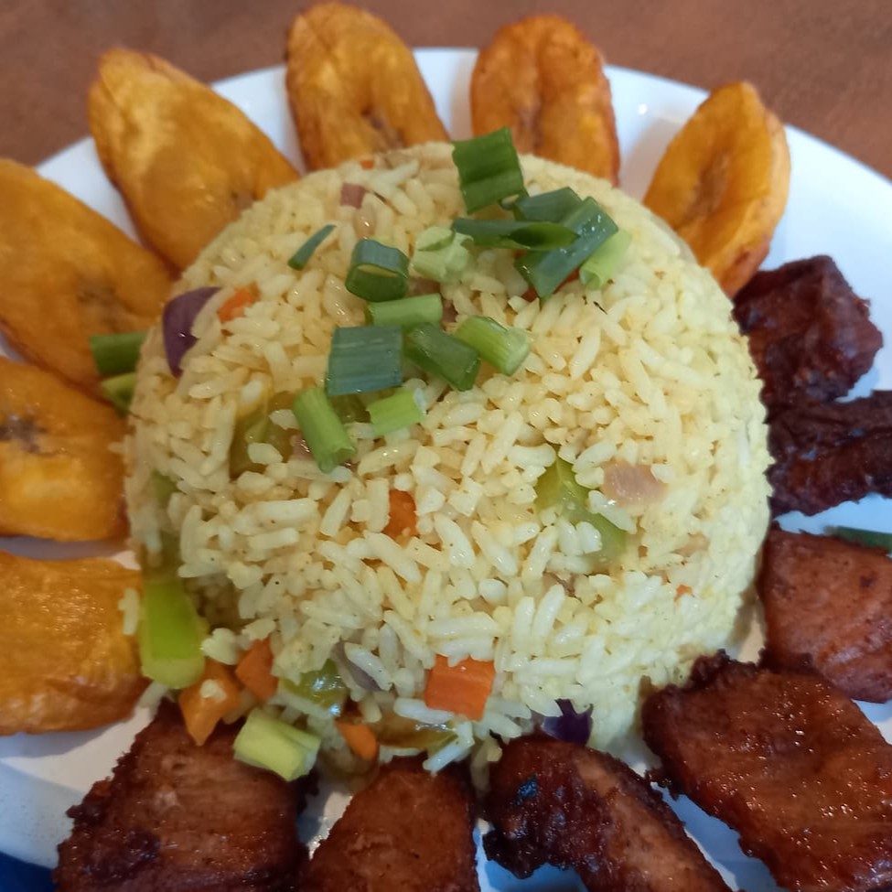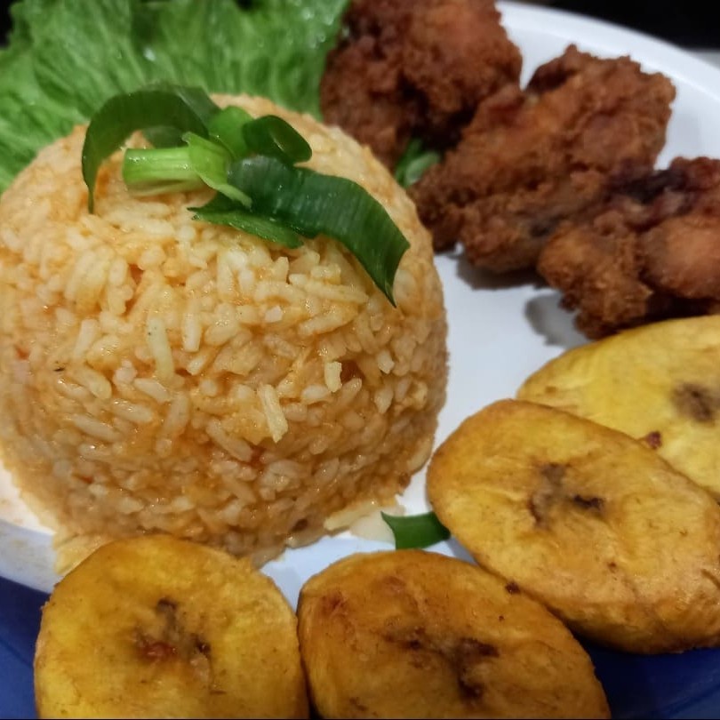 Saborosa comida nigeriana feita com ingredientes de qualidade, tomate, cebola, pimentão, arroz e banana frita. Saboreie esse delícia de sabor inconfundível!