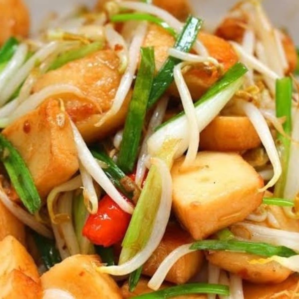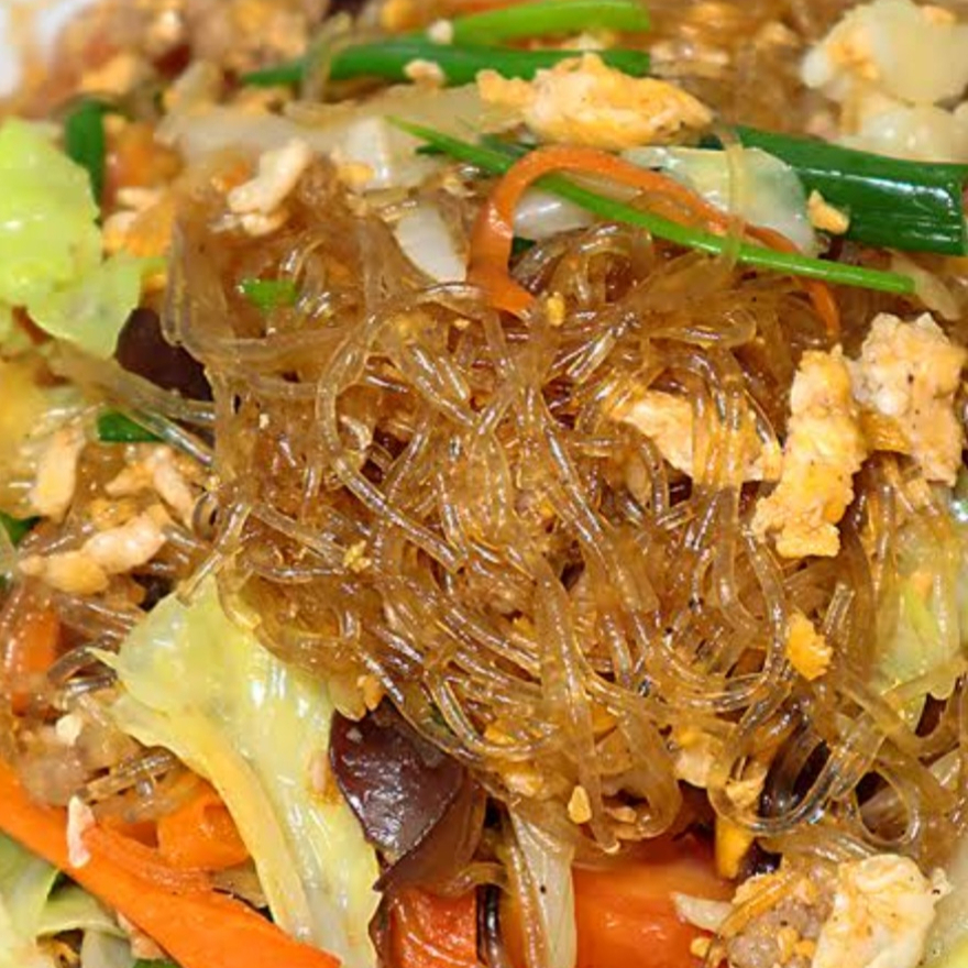 Contém óleo, tofu, broto de feijão, cenoura, cebolinha, sal, molho de soja, açúcar, sem adição de carne. Com Arroz
