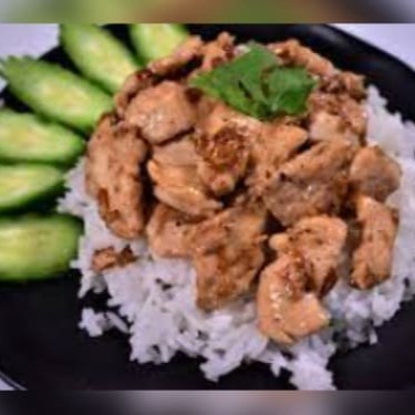 “Nam Tok de frango grelhado com cebola, cebolinha e pimenta, servido com arroz branco.”
