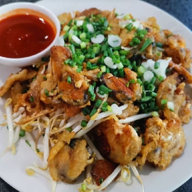 Matéria-prima Mexilhões ovo farinha de arroz Farinha de trigo multiuso sal cebolinhas em fatias finas, broto de feijão alho picado Óleo para fritar açúcar molho de soja Água molho de tempero