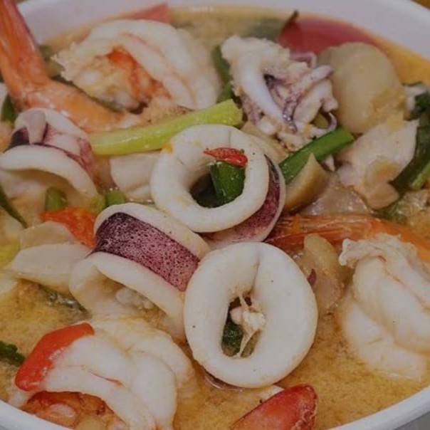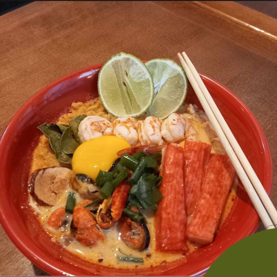 Tom yum de frutos do mar com sabor bem tailandês, servido com macarrão de arroz, camarão, lula, surimi, gema de ovo e cogumelos. Sabor intenso e delicioso.