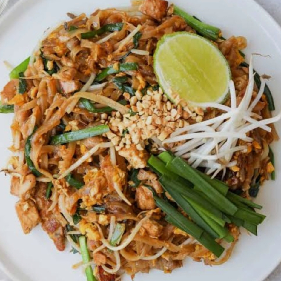 Pad Thai com tofu Um dos pratos tailandeses mais famosos! Macarrão de arroz salteado com molho especial tailandês, ovo, broto de feijão, cebolinha e amendoim triturado. Sabor agridoce, aromático e muito delicioso!