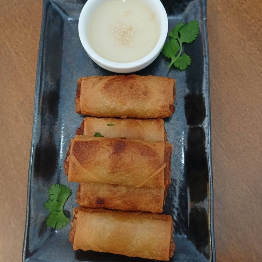 O rolinho primavera tem macarrão de arroz, repolho e cenoura. Não contém carne.