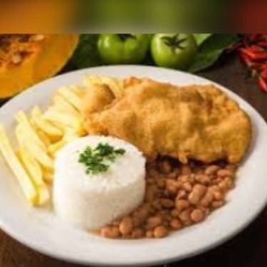Filé de frango empanado à milanesa, acompanhado de arroz soltinho, feijão temperado, farofa crocante, couve refogada e batata frita. Uma opção deliciosa e completa, perfeita para um almoço que vai satisfazer!