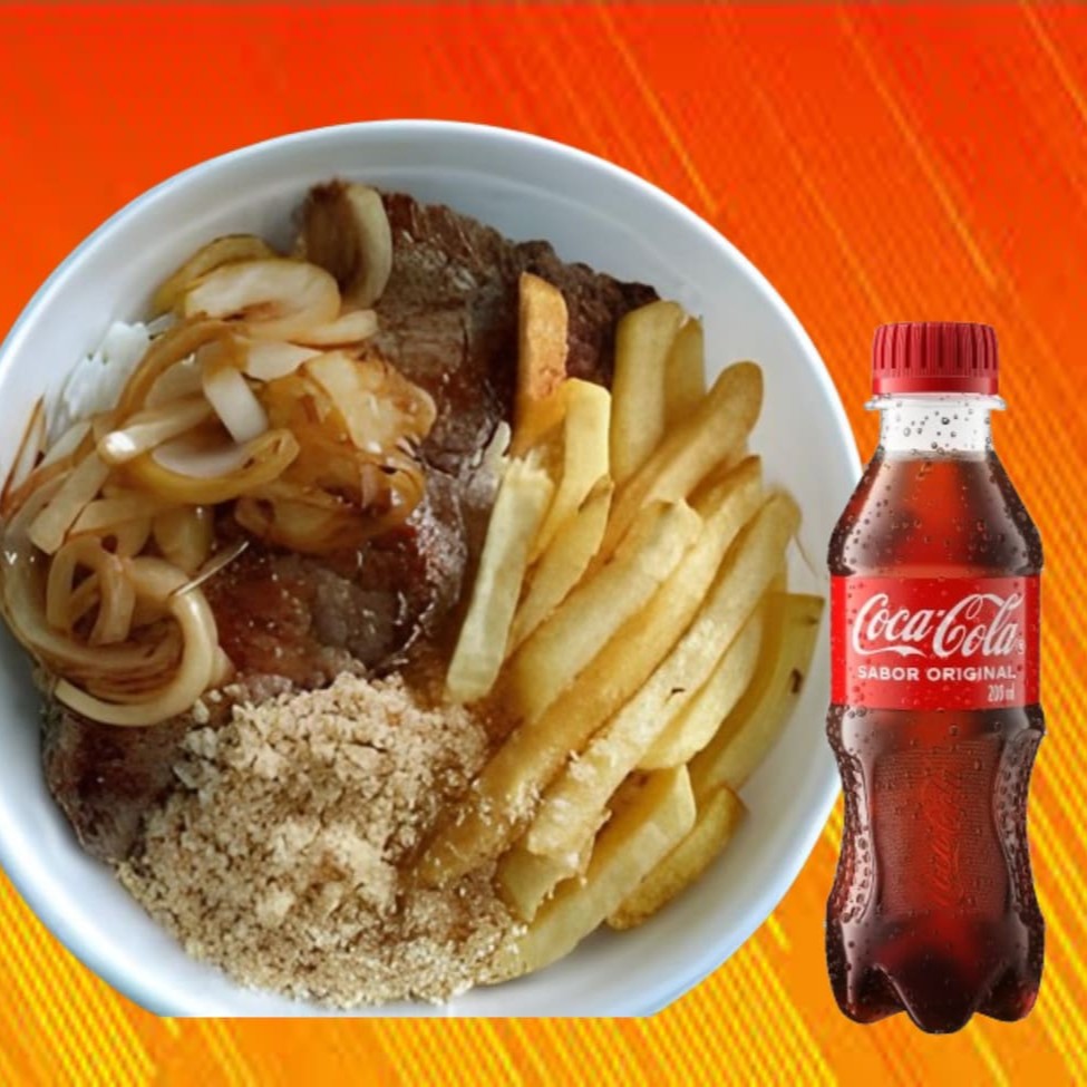 Um combo completo e irresistível! Bife suculento grelhado, acompanhado de arroz, feijão, farofa, couve e batata frita, finalizado com uma Coca-Cola 200ml geladinha.