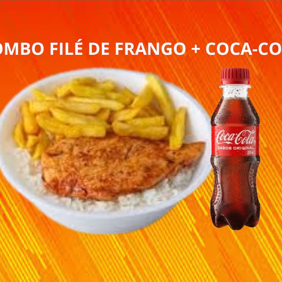 Combo de Filé de Frango à Milanesa: Inclui frango empanado, servido com arroz, feijão e batatas fritas, acompanhado de uma Coca-Cola de 200 ml. Uma refeição prática e saborosa para qualquer hora.