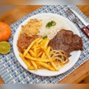 Bife grelhado, macio e cheio de sabor, acompanhado de arroz, feijão, batata frita e um guarana bem geladinho.