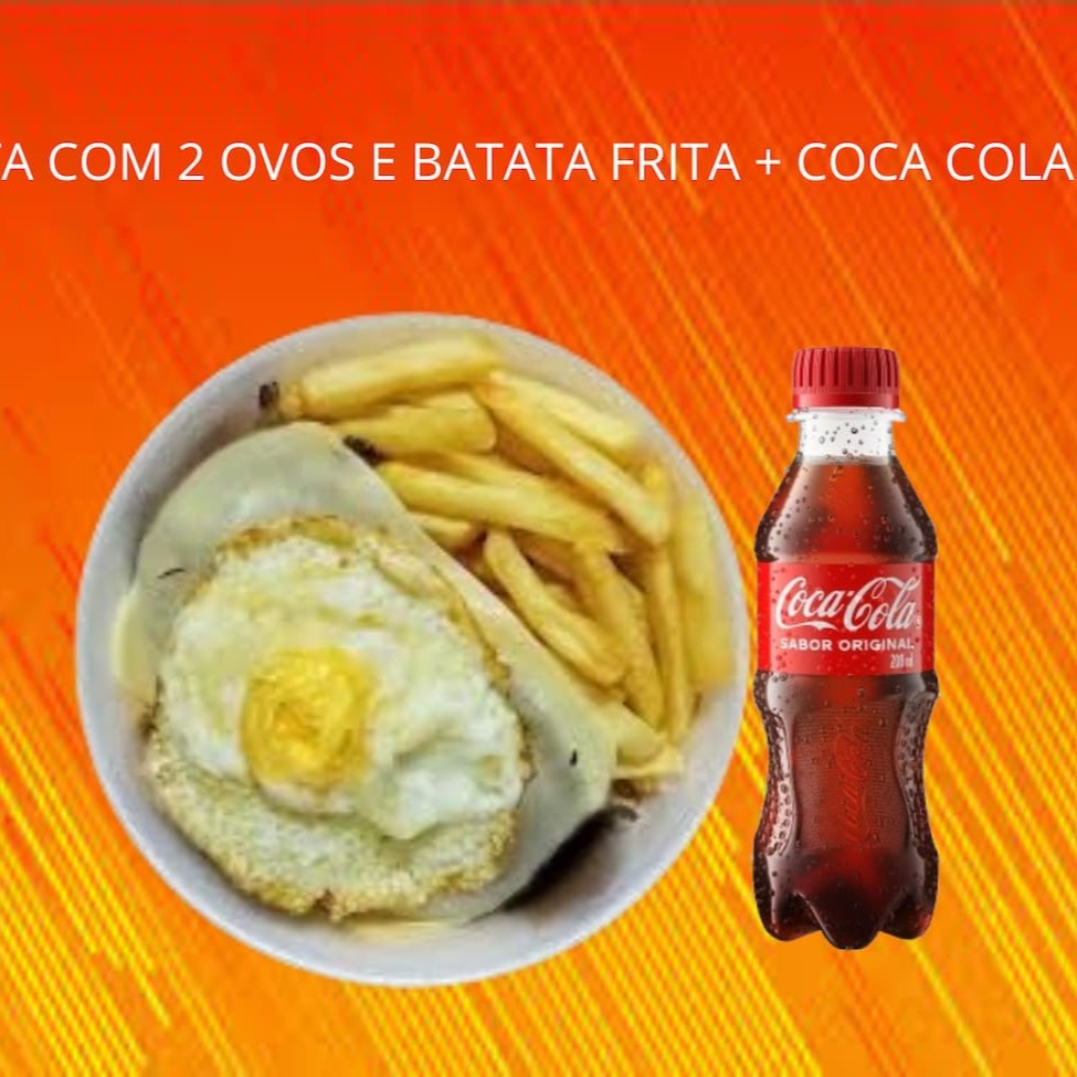 Aproveite uma refeição prática e saborosa com 2 ovos fritos, batatas fritas crocantes, arroz e feijão. Inclui uma Coca-Cola de 200 ml para completar seu almoço.