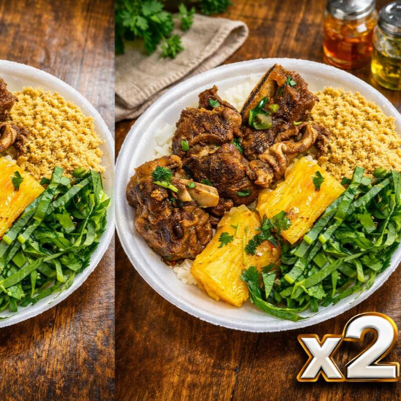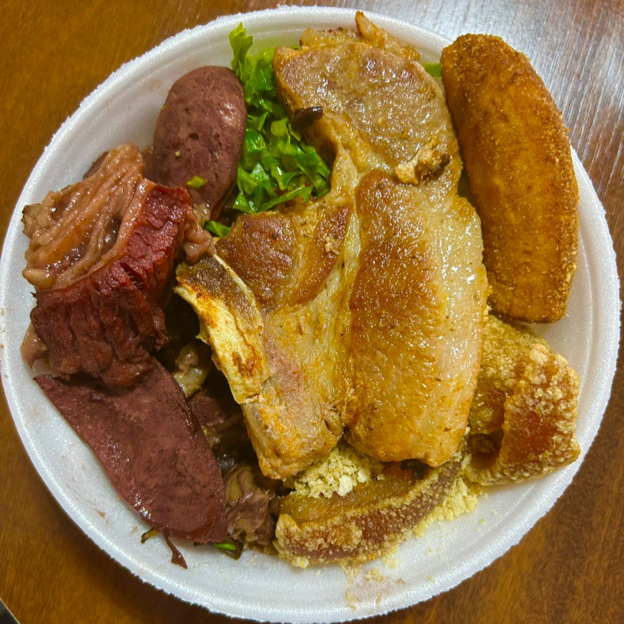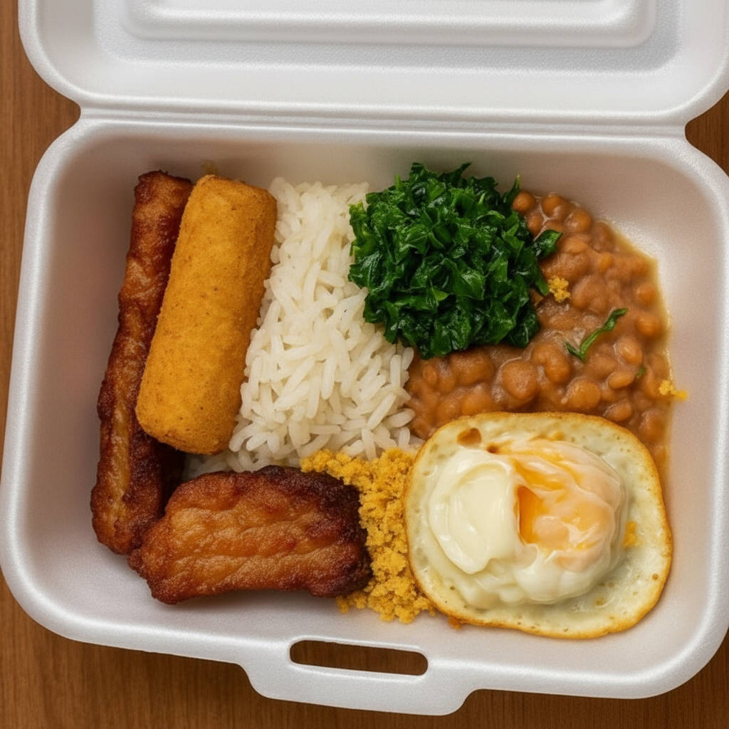 Tutu de feijão, arroz, couve refogada, farofa crocante, costelinha suína, banana à milanesa e ovo frito. Uma porção cheia de identidade!