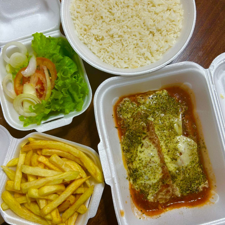 Saboreie nosso delicioso contra file a parmegiana acompanhado de arroz branco e batata frita crocante. Todos os itens são enviados separados.