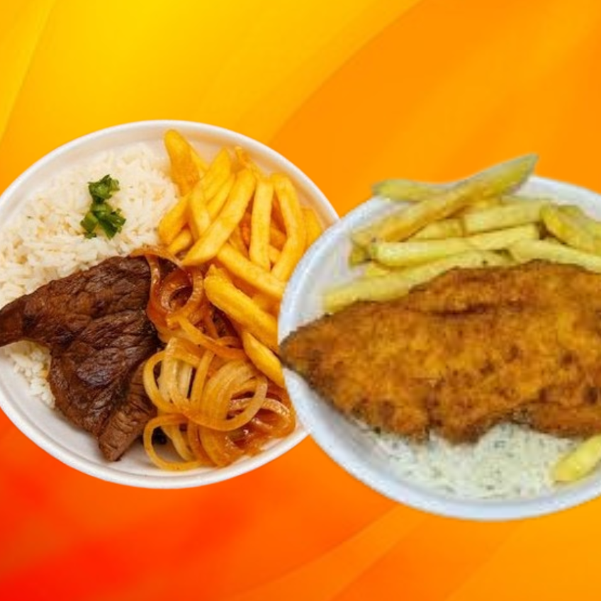 Duas marmitex, cada uma com um suculento bife, acompanhado de arroz, feijão e batatas fritas. Inclui também uma Coca-Cola de 200 ml por marmita para completar sua refeição.