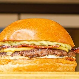 Pão brioche selado na manteiga, burguer de 80 gramas, mussarela fatiada, ovo frito, bacon fatiado e maionese senhora.