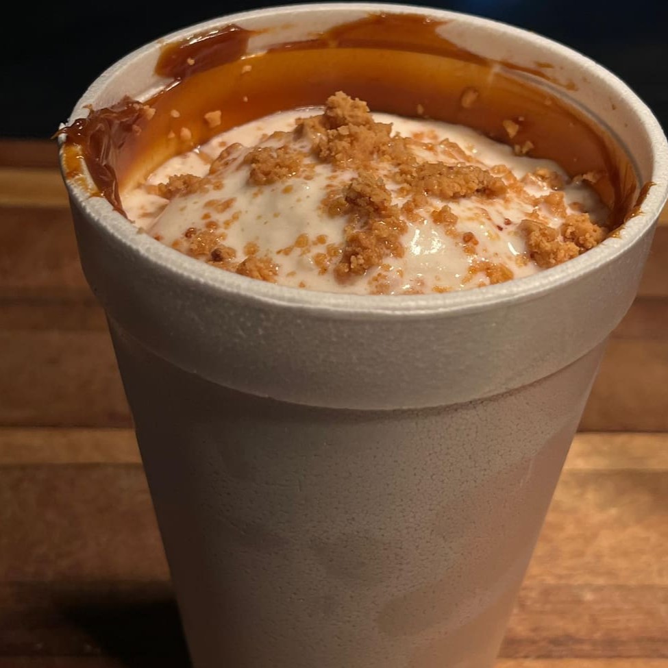 Feito com creme americano, cremoso, geladinho e com pedacinhos de paçoca em cada gole. Vai na embalagem de isopor de 473ml pra chegar do jeitinho certo: perfeito!