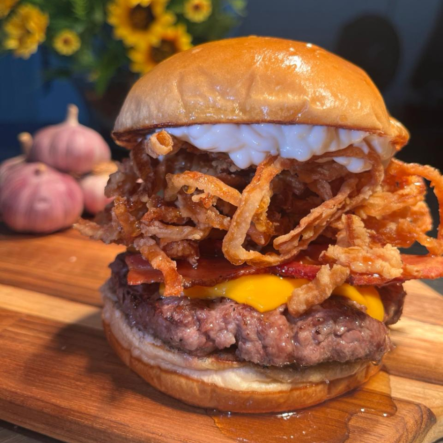 Pão tipo brioche selado na manteiga, 4 burguers de 80g, cheddar fatiado, bacon fatiado, onion rings, molho barbecue e maionese senhora.