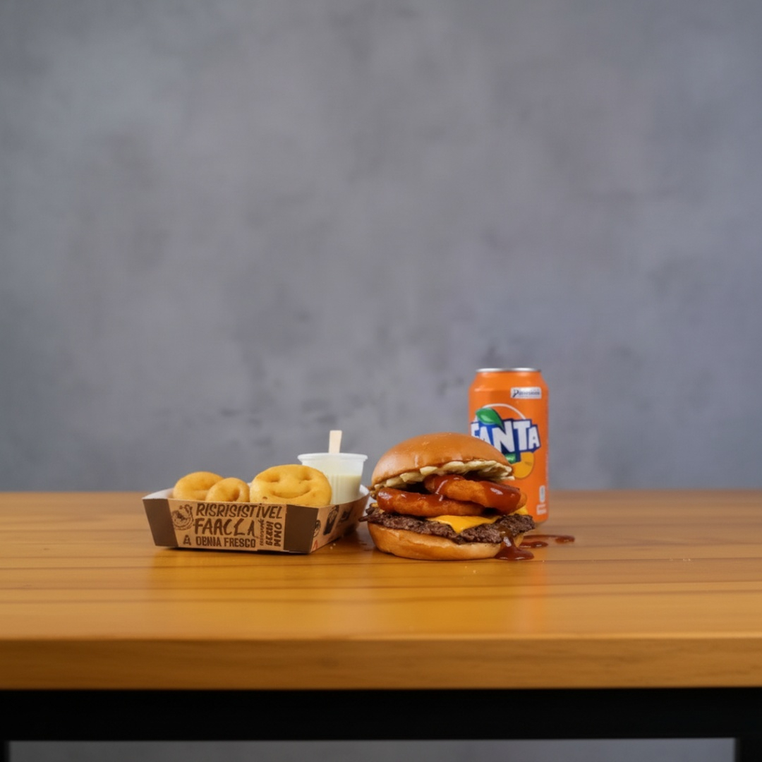Pão tipo brioche selado na manteiga, burger de 80g, queijo cheddar fatiado, onion rings crocantes, molho barbecue defumado e a maionese especial da senhora. Um lanche cheio de personalidade, com aquela combinação que dá vontade de repetir sempre.