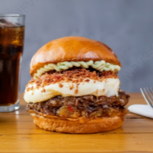 Pão brioche selado na manteiga, 2 burguers de 160g, cheddar fatiado, muçarela fatiada, bacon fatiado, alface, tomate verde, cebola roxa picadinha, molho especial a base de picles e maionese senhora.