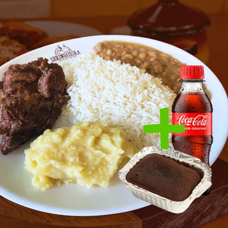Carne bovina cozida com legumes, arroz, feijão e purê de batata. Acompanha uma Coca-Cola 200ml e uma sobremesa a sua escolha.